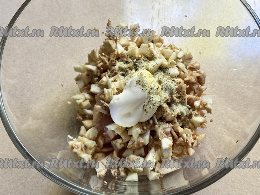 В миске соединить мясной фарш (можно взять фарш из любого мяса, у меня - куриный фарш) и мелко нарезанную мякоть баклажанов, майонез, соль и специи.