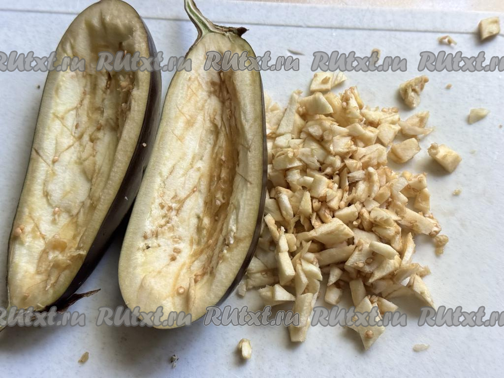Сделать на мякоти баклажанов крестообразные надрезы ножом, чтобы легче было вынимать мякоть. А затем удалить часть мякоти из баклажана, сформировав бортики лодочки. Вынутую из баклажанов мякоть мелко нарезать.