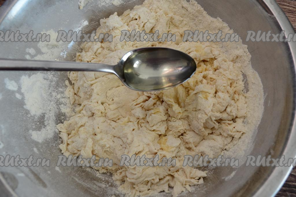 Начать замес теста столовой ложкой. Как только тесто будет трудно перемешивать ложкой, влить в тесто растительное масло. Вмешать масло в тесто и продолжить замес уже руками.