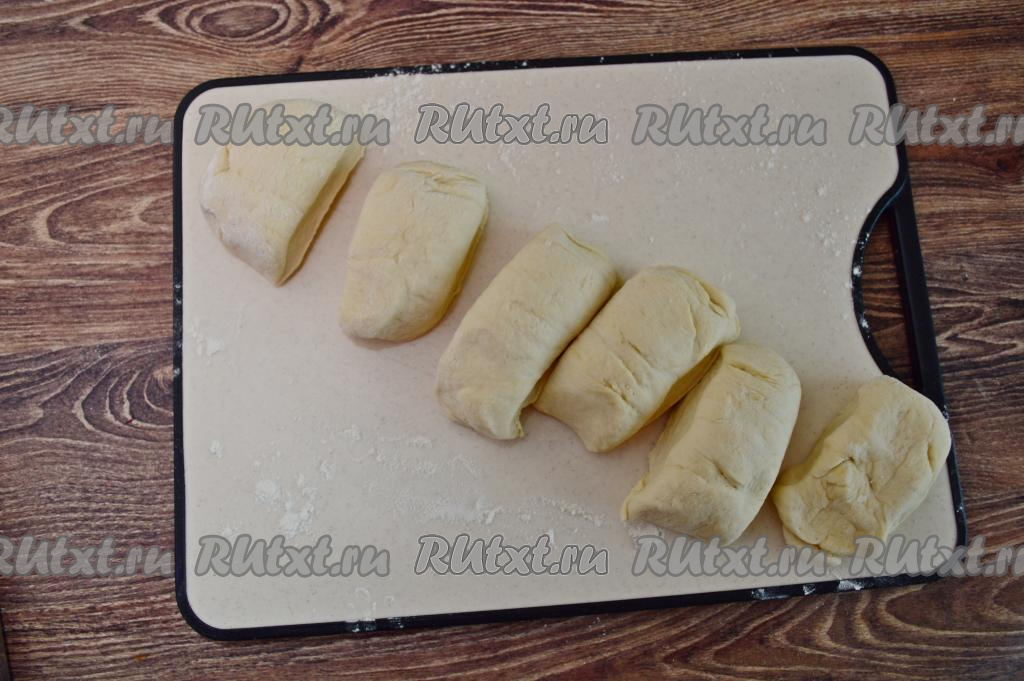 Поднявшееся тесто обмять и разделить на 6 примерно равных частей. У меня каждая часть весила 110-120 грамм.