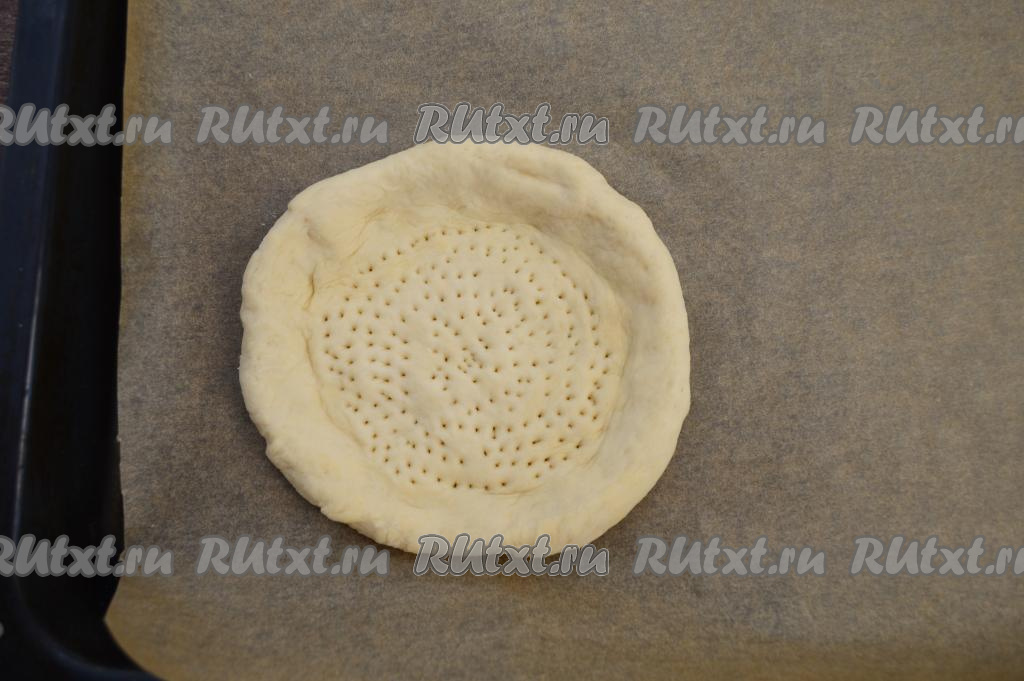 Сформированную лепёшку переложить на противень, застеленный пергаментом. При помощи вилки сделать на плоской части лепёшки глубокие наколы.