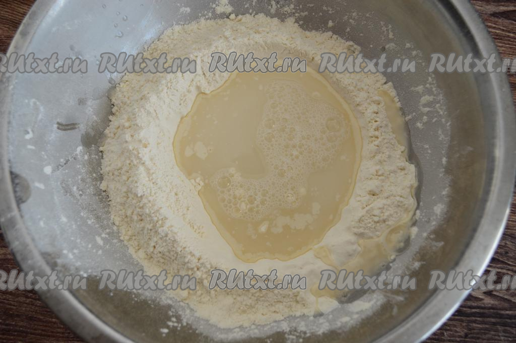 Перемешать муку и дрожжи, затем сделать в центре воронку.