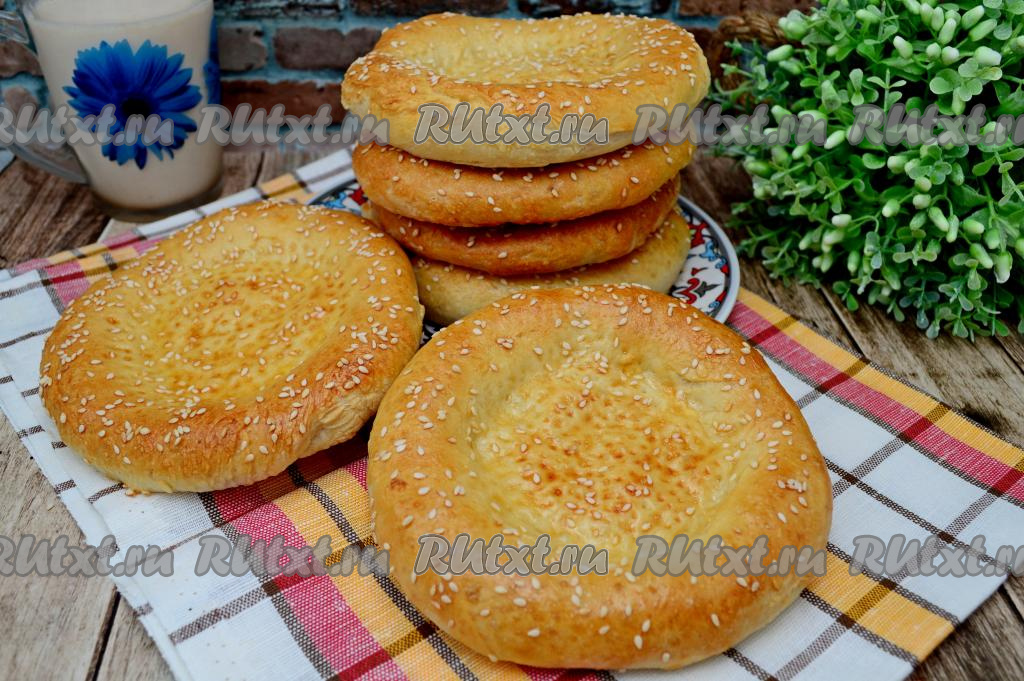 Узбекские лепёшки выпекать в разогретой до 180 градусов духовке примерно 15-20 минут (до лёгкого подрумянивания теста, замешанного на дрожжах и воде).