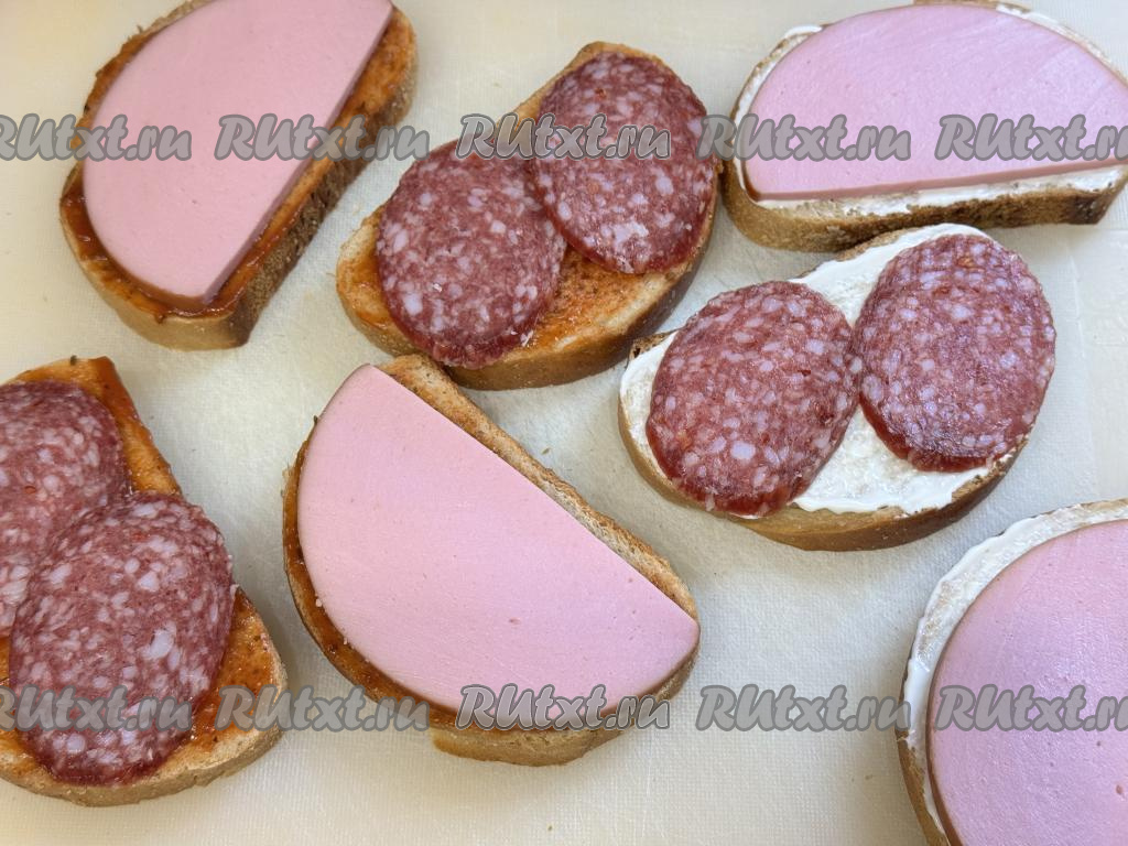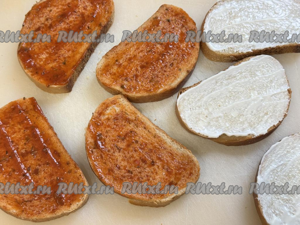 Кусочки хлеба смазать кетчупом или майонезом - кто как любит.