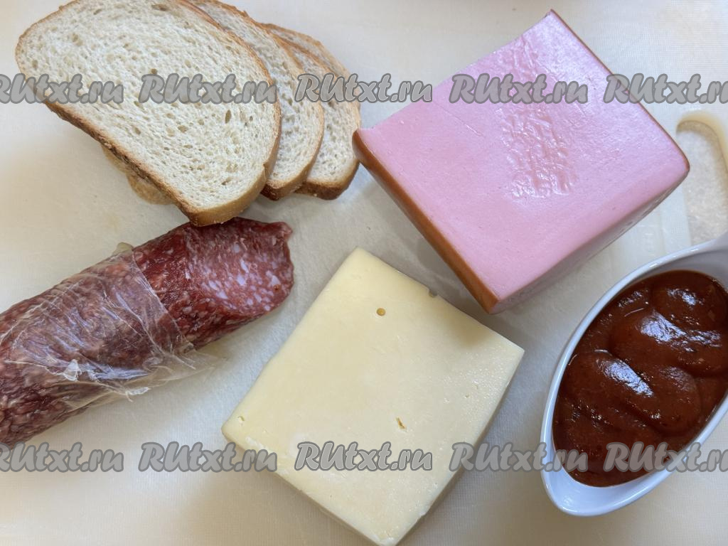 Подготовить продукты. Колбасу можно взять любую по вашему вкусу. Я взяла два вида: сырокопчёную и варёную. Сыр подойдёт и твёрдый, и полутвёрдый.