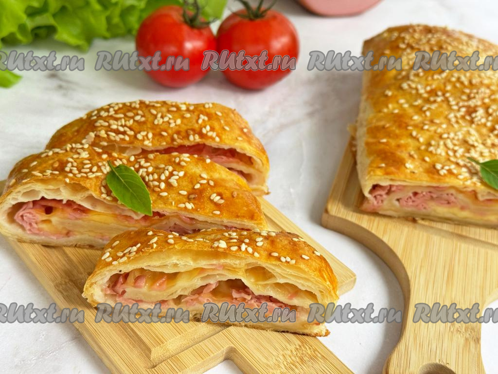 Покупное слоёное тесто достаточно часто приходит на выручку, когда нет времени или желания заниматься замешиванием теста. В этот раз решила испечь из слоёного теста в духовке аппетитный, воздушный рулет с нежнейшей начинкой из колбасы и сыра. Эту вкусную, сытную выпечку можно подать к чаю или в качестве перекуса в течение дня.