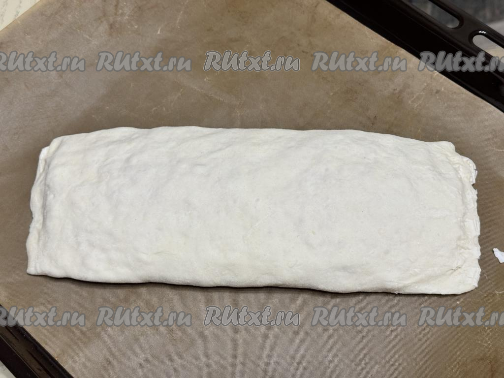 Начиная с узкого края пласта, сделать один заворот теста с начинкой на 1/3 длины (как на фото). Затем сделать ещё два заворота, сформировав плоский рулет.