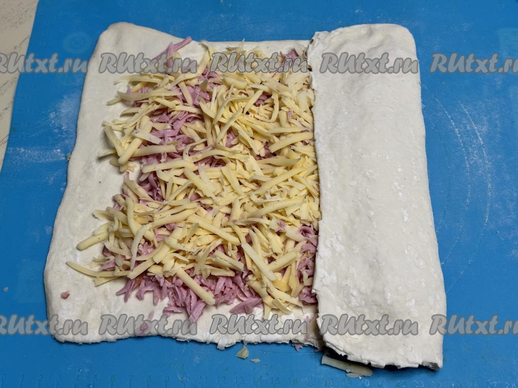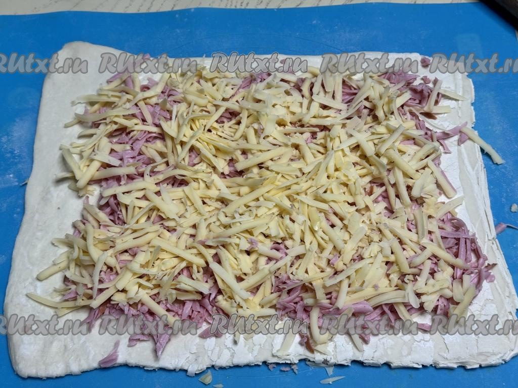 Подготовить продукты. Слоёное тесто можно взять и дрожжевое, и бездрожжевое (у меня - бездрожжевое). Сыр подойдёт любой твёрдых или полутвёрдых сортов.