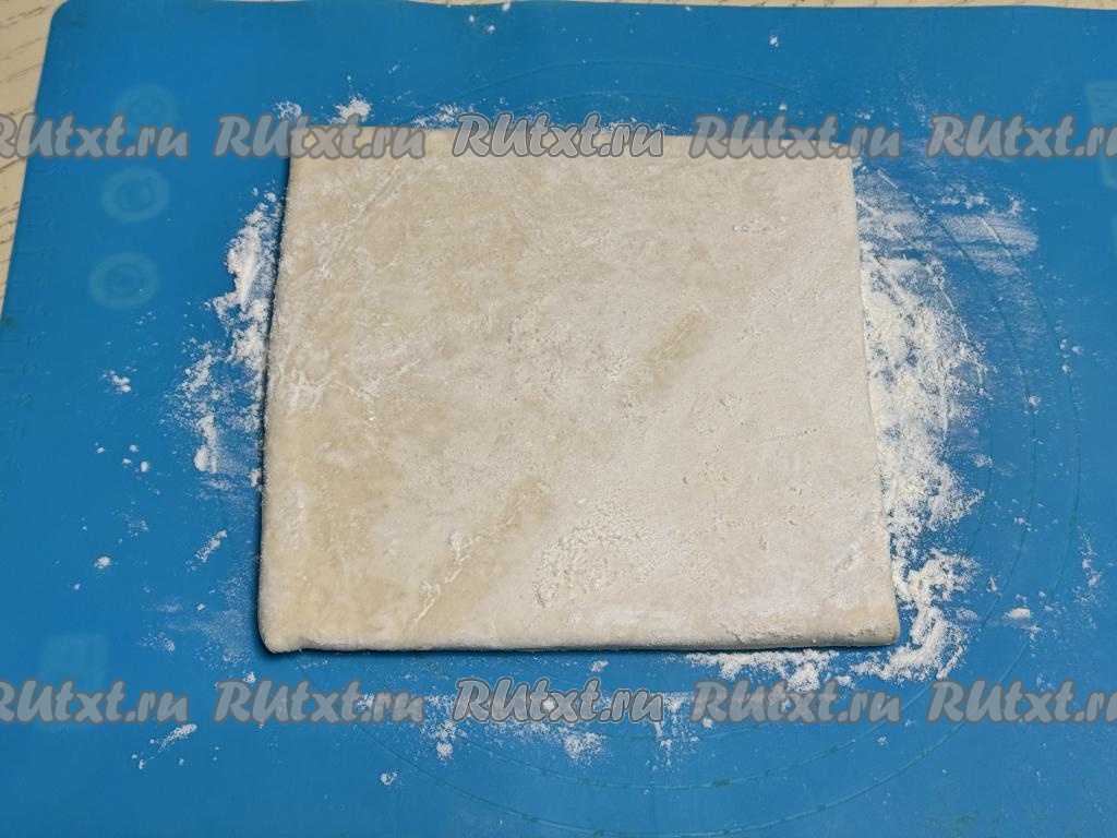 Пласт теста заранее достать из холодильника и разморозить при комнатной температуре. Выложить размороженный пласт на припылённую мукой поверхность.