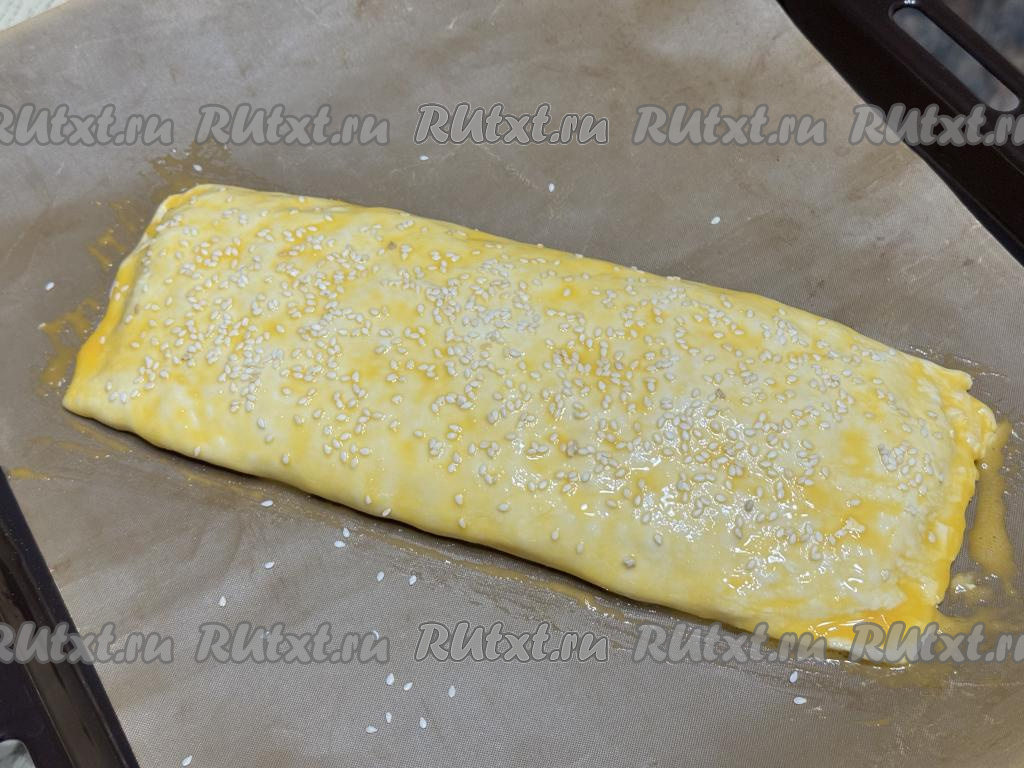 Рулет из слоёного теста с сырно-колбасной начинкой переложить на противень, застеленный ковриком (или пергаментом) для выпечки.