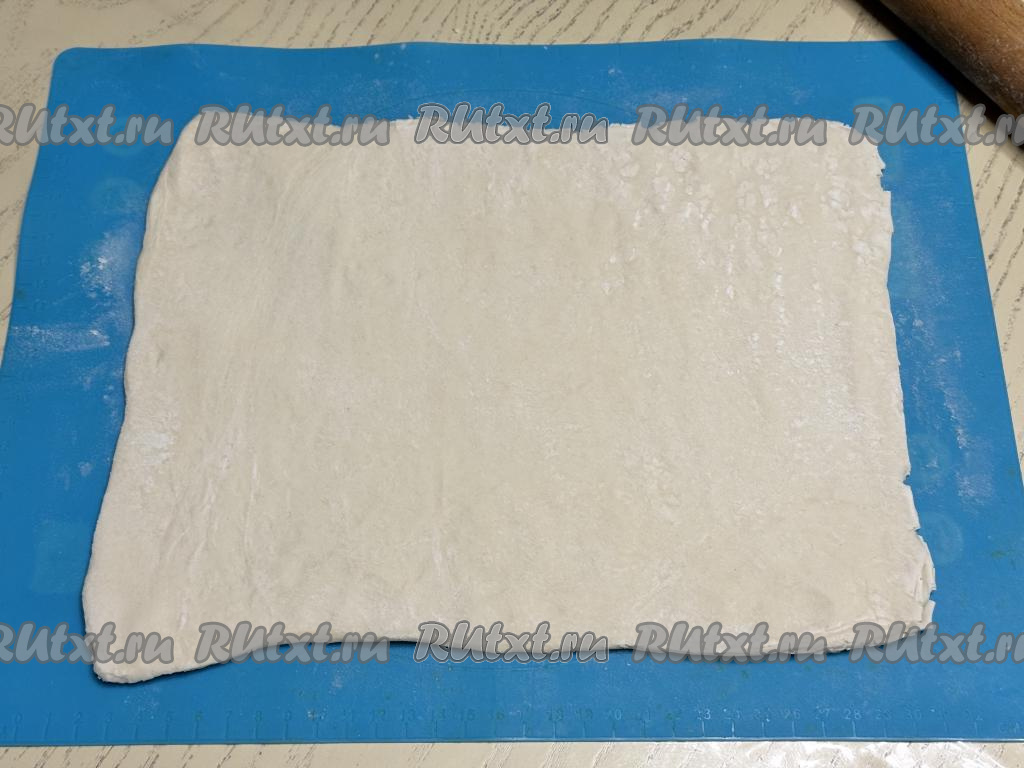 Раскатать тесто скалкой в прямоугольник толщиной примерно 2-3 миллиметра.