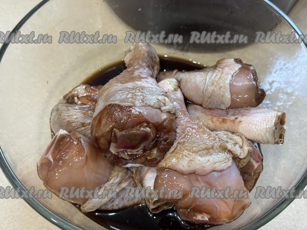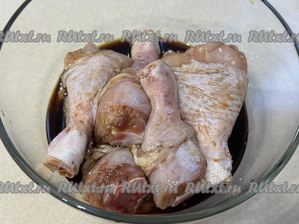 Перемешать, покрывая ножки соевым соусом со всех сторон, оставить мариноваться при комнатной температуре минимум на 30 минут. За это время нужно будет 2-3 раза перемешать голени, чтобы мясо равномерно промариновалось со всех сторон (можно оставить мариноваться и на более длительное время, но тогда нужно миску с кусочками курицы накрыть крышкой и поставить в холодильник).