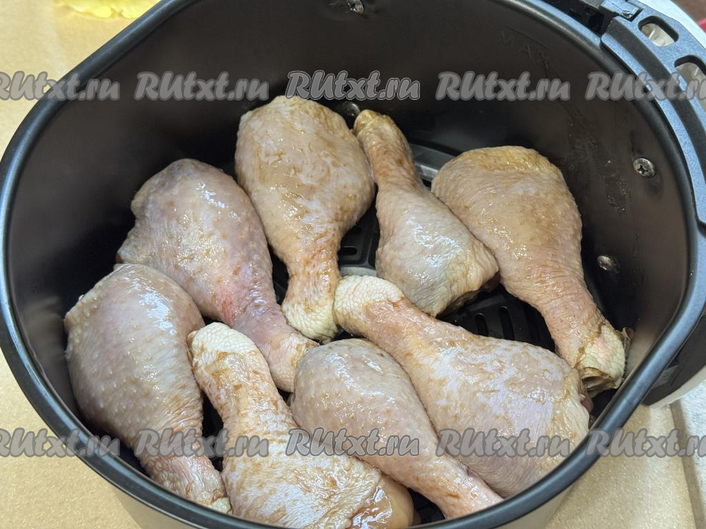 Куриные ножки, промариновавшиеся в соевом соусе, выложить в один слой в чашу аэрогриля, крышку закрыть, запекать при 200 градусах 10 минут.