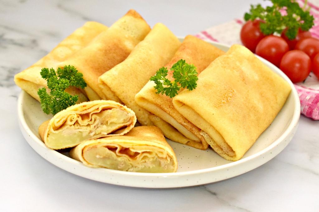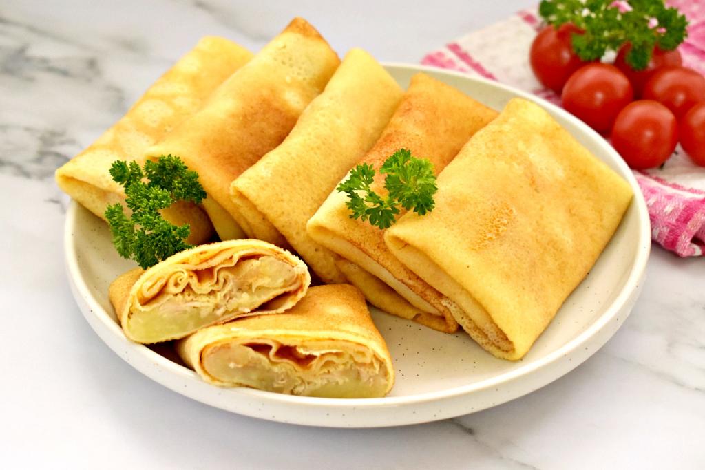 Блины - одно из любимых блюд в моём меню, они идеально подходят как для завтрака, так и для ужина. При желании в них можно завернуть и сладкие, и несладкие начинки. В этот раз решила приготовить блины с нежной начинкой из варёных курицы и картошки. Блинное тесто замесила на молоке, поэтому блинчики получились достаточно тонкими, они хорошо переворачиваются при жарке, не рвутся в процессе заворачивания в них начинки. Аппетитные, вкусные, нежные, сытные блины с мясом курицы и картошкой можно подать и на ужин, и на завтрак. Я предпочитаю подавать их тёплыми, ну а если они остыли, их можно подогреть в микроволновке или на сковороде.