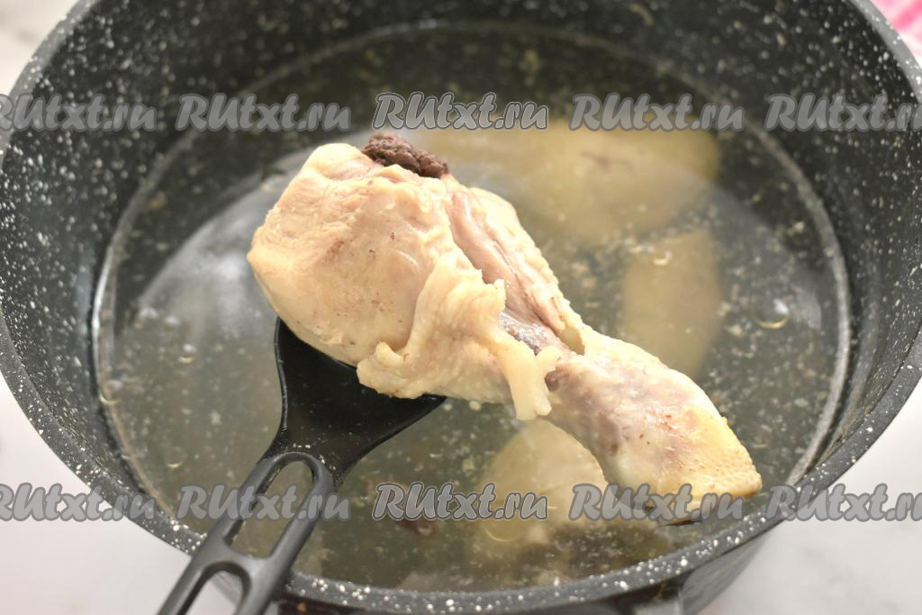 В качестве мяса для начинки я использовала куриные голени, но можно взять и бёдра или куриную грудку. Вымытые части курицы выкладываем в кастрюлю, заливаем полностью водой, ставим на сильный огонь. После закипания воды, добавив немного соли, отвариваем мясо на небольшом огне до готовности (в течение минут 30). Сварившиеся части курицы достаём из кастрюли, даём им немного остыть и отделяем от костей.