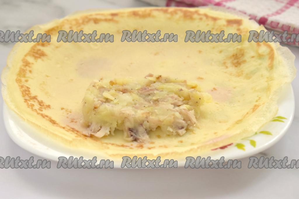 После того как все блины будут пожарены, можно приступать к фаршировке. С одной стороны блина выкладываем примерно 2 столовых ложки начинки из картошки и курицы, немного отступая от краёв блинчика. Затем подворачиваем боковые края блина на начинку, и, начиная со стороны с начинкой, сворачиваем блин в достаточно плоский рулет.