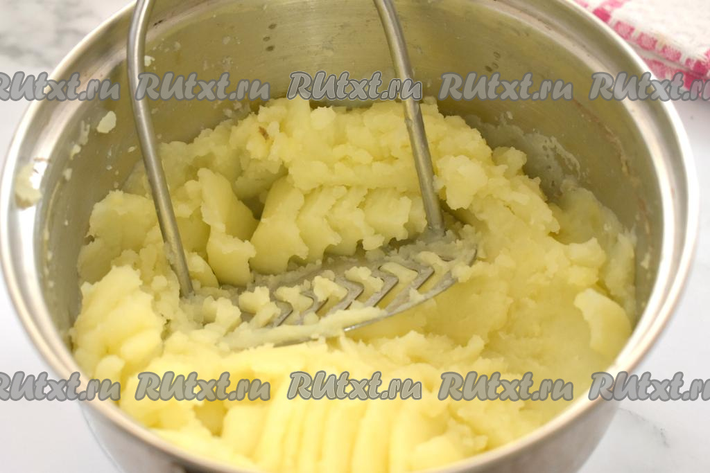 С помощью толкушки разминаем картофель вместе с 70 миллилитрами воды, оставшимися в кастрюле.