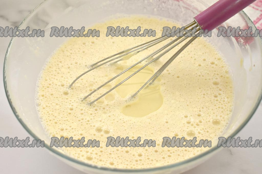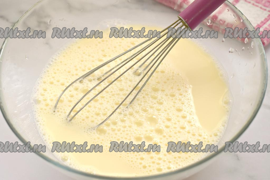 Молоко подогреваем до комнатной температуры (я подогрела молоко на плите, можно подогреть в микроволновке). В миску со взбитыми яйцами вливаем молоко комнатной температуры, перемешиваем венчиком.
