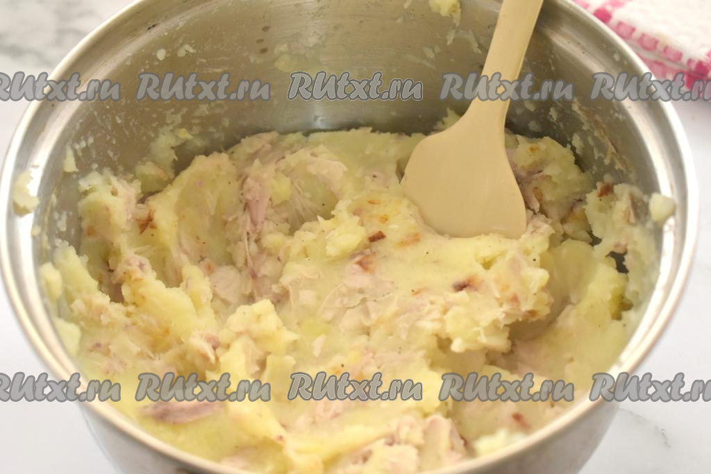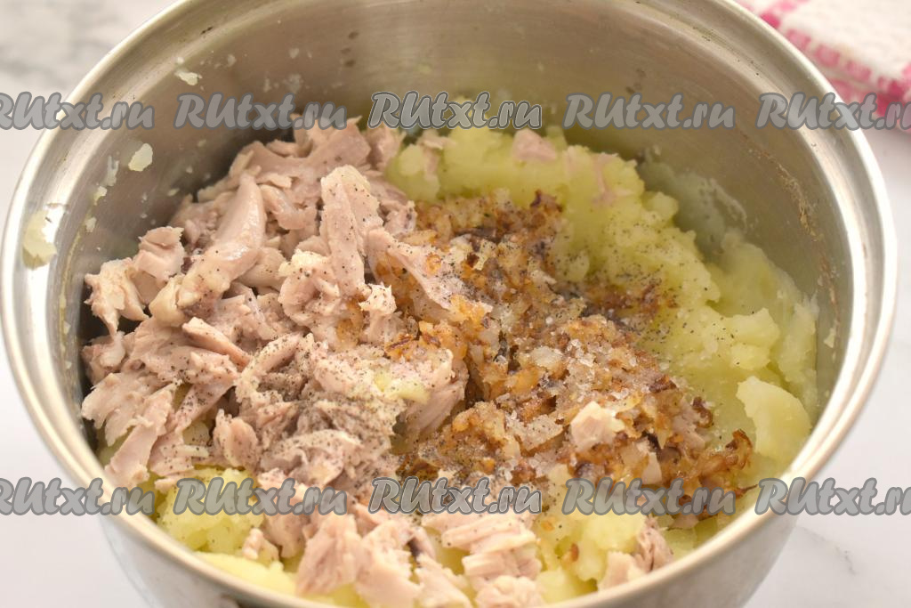 В получившееся однородное картофельное пюре добавляем нарезанное варёное куриное мясо и обжаренный лук, по вкусу перчим.