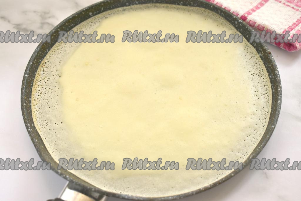 Так как количество муки, которое придётся добавить, может зависеть от размера яиц и от свойств самой муки, я советую подсыпать муку именно небольшими порциями, тщательно вмешивая её и контролируя густоту замешиваемого блинного теста.