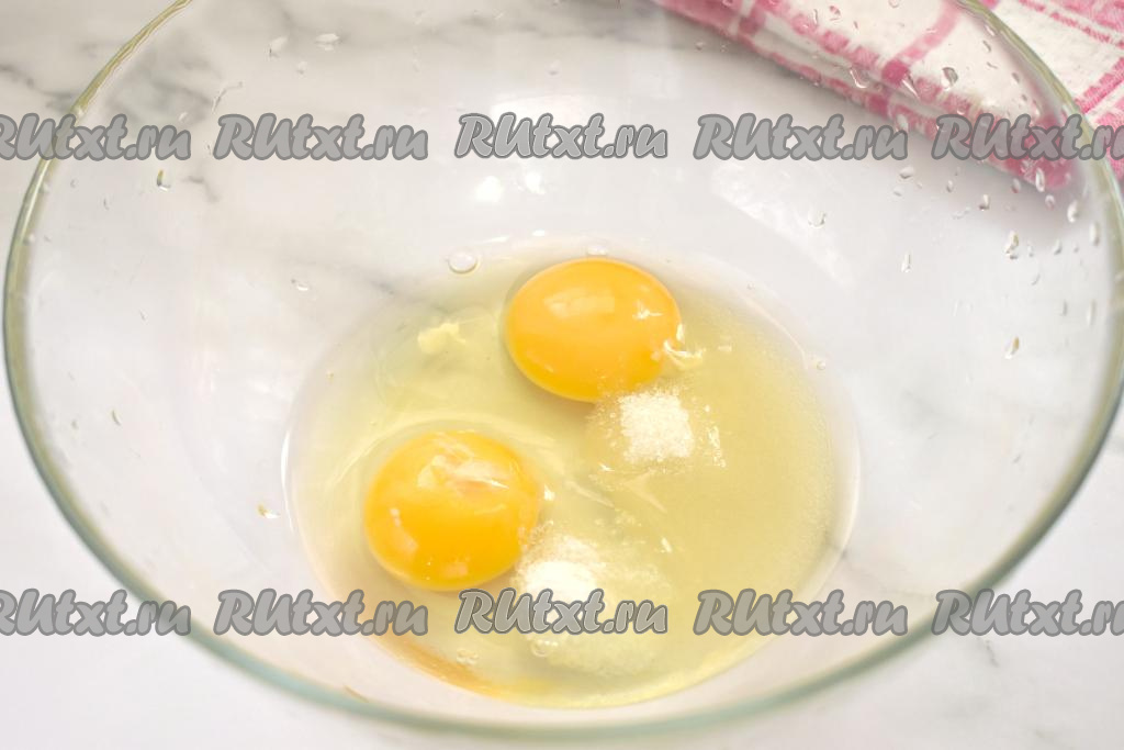 Для замешивания блинного теста в глубокую миску вбиваем яйца, добавляем соль и сахар, взбиваем венчиком до однородности.