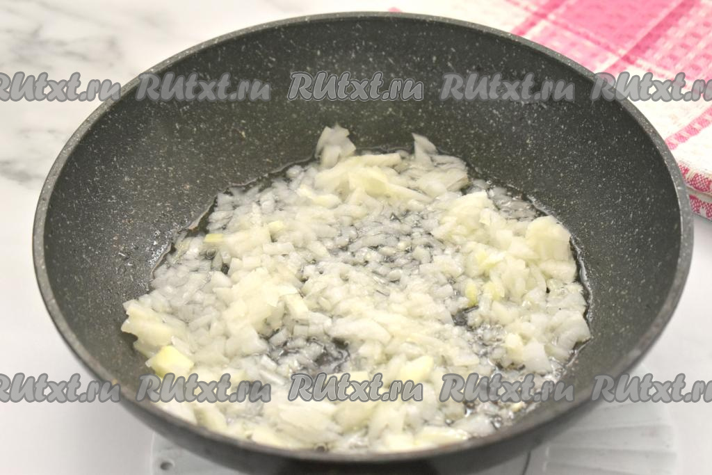 Пока в разных кастрюлях варятся курица и картошка, займёмся луком. Очищаем лук, нарезаем мелко и выкладываем в сковороду с разогревшимся растительным маслом. Обжариваем лук на среднем огне до золотистости (примерно 4-5 минут), периодически перемешивая.