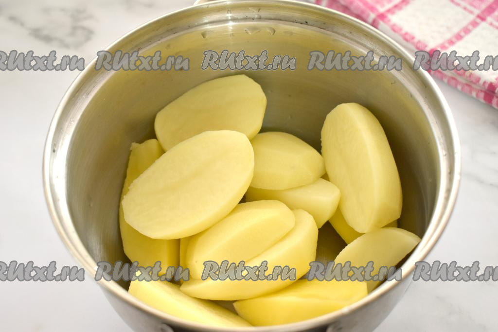 Пока варится мясо, в другую кастрюлю выкладываем очищенный и нарезанный на части картофель, заливаем полностью водой, ставим на огонь, а после закипания, добавив соль и уменьшив огонь, отвариваем до готовности (на варку потребуется минут 25 с момента закипания воды, готовые картошины должны легко прокалываться вилкой). После того как картошка сварится, сливаем большую часть воды, в которой готовился картофель, оставляя в кастрюле миллилитров 70 воды.
