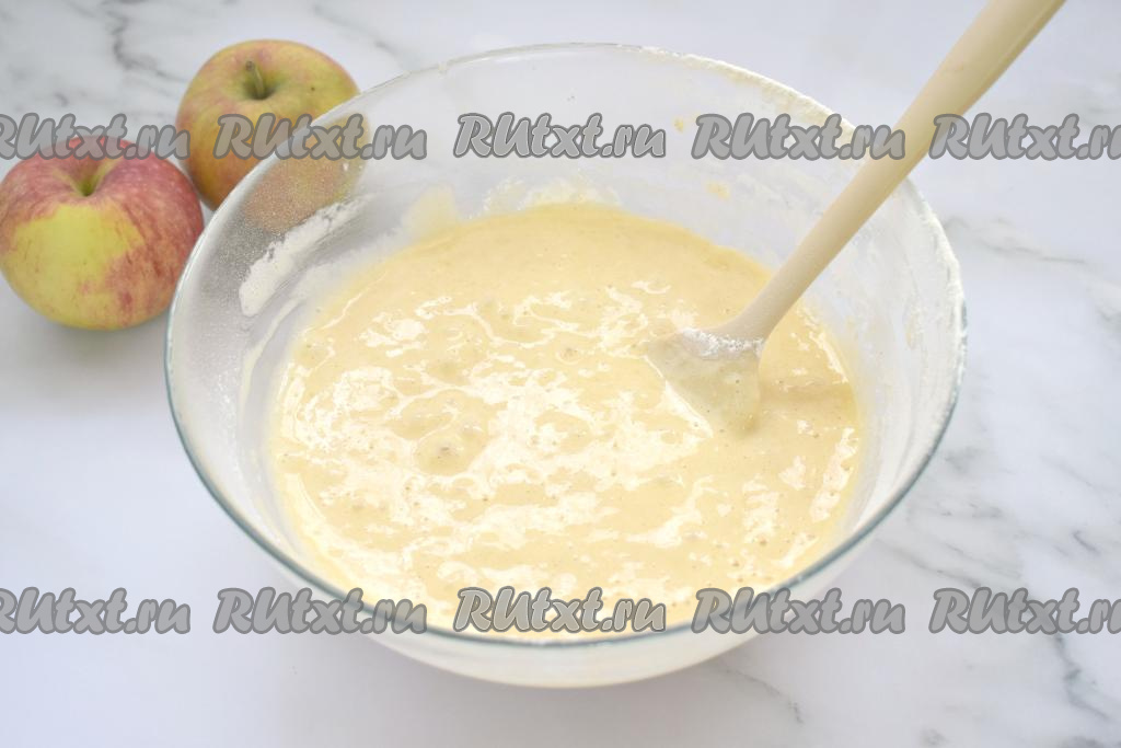 Перемешиваем тесто для пирога лопаткой (или столовой ложкой), стараясь не сбить воздушность взбитых яиц. Частями добавляя оставшуюся рисовую муку, замешиваем однородное, нежное тесто, напоминающее сметану средней жирности.