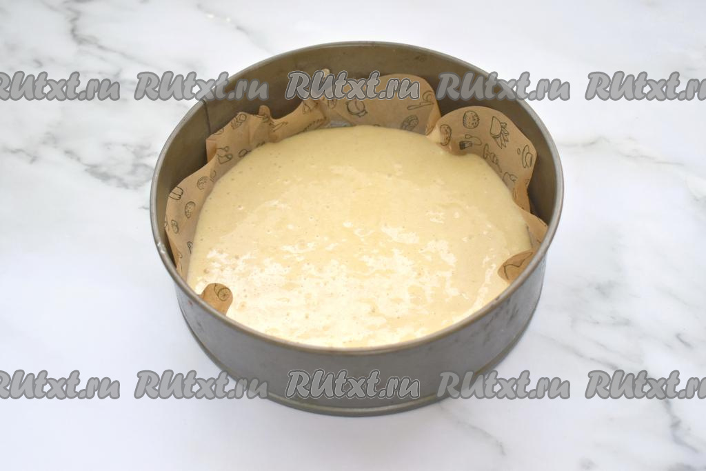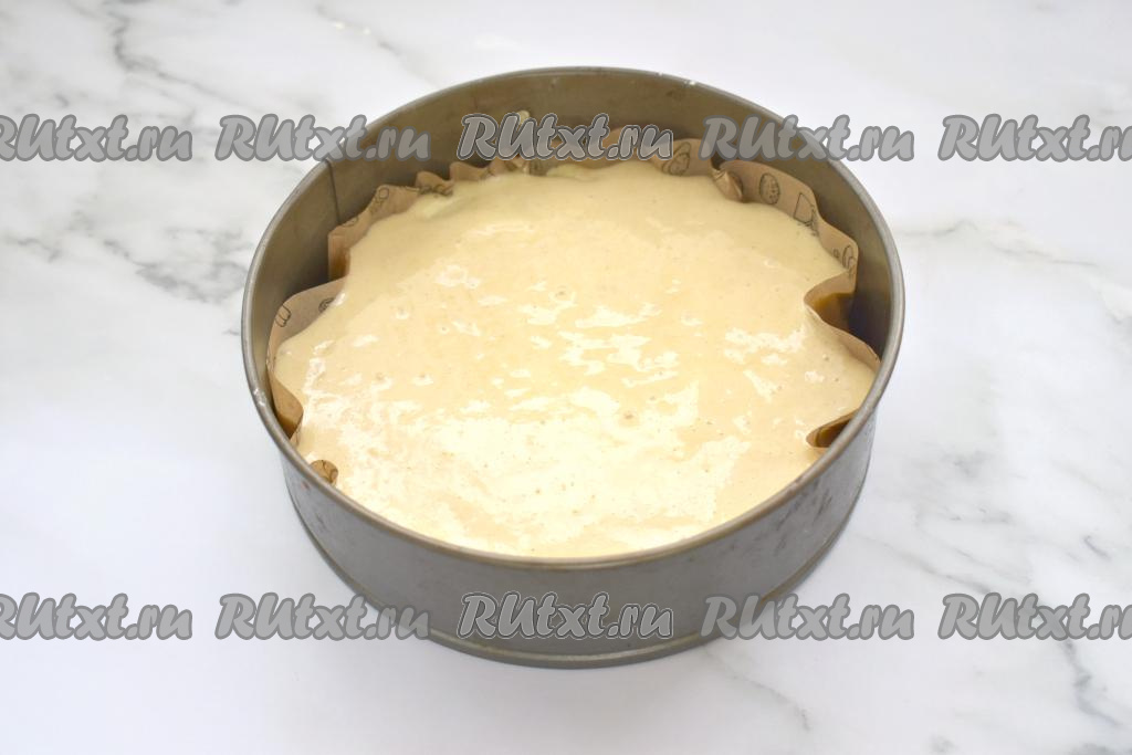 Разъёмную форму для выпечки (я использовала форму диаметром 20 сантиметров) застилаем пергаментом (или смазываем маслом), выкладываем половину теста, замешанного на рисовой муке, разравниваем.
