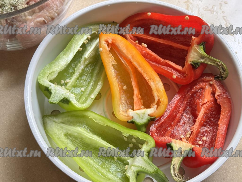 Налить воду, примерно 1,5 литра в чашу мультиварки, закрыть крышку и выставить режим "На пару". Как только прозвучит сигнал, значит вода закипела. Пока закипает вода, болгарские перцы вымыть, разрезать вдоль, удалить семена, плодоножку я решила оставить. Промыть перцы водой. Выложить перцы срезом вверх в чашу мультиварки для приготовления на пару. Я взяла крупные перцы, поэтому в чашу мультиварки на пару у меня поместились 2,5 перца. Но если вы возьмёте не очень крупные перцы, то 3 перца точно поместятся.