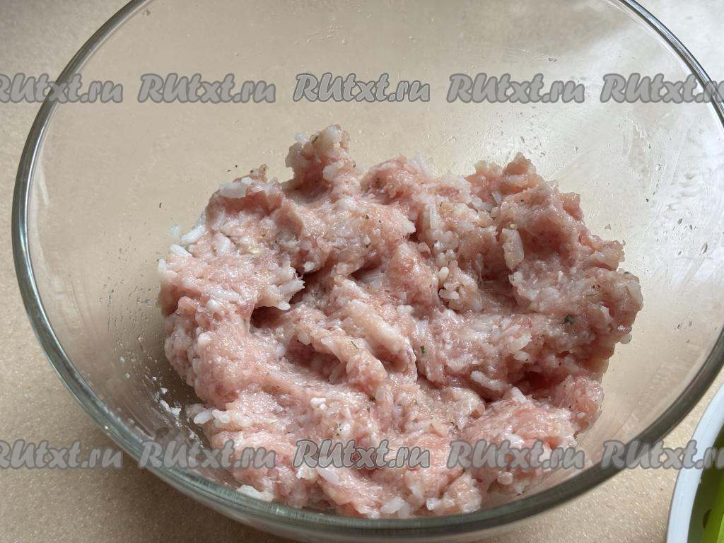 В миске соединить мясной фарш, остывший рис, добавить соль и любые специи по вкусу (в качестве специй, например, подойдёт чёрный молотый перец, я использовала соль, уже смешанную со специями).
