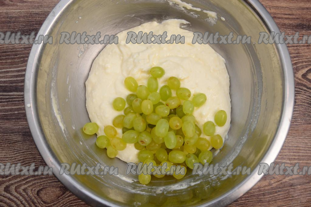 Перемешать виноград и творожную массу до однородности. Затем всыпать муку.