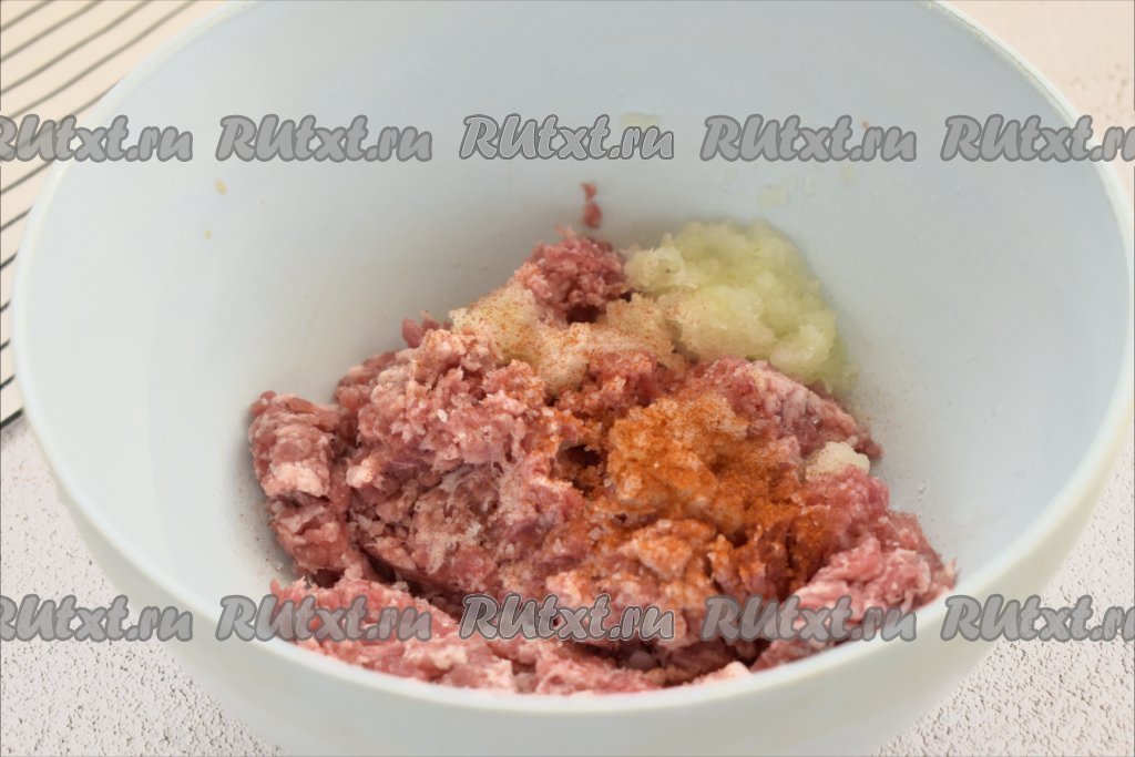 Для получения фарша для формирования фрикаделек можно взять любое мясо без костей (у меня - свинина). Моем мясо, обсушиваем, пропускаем через мясорубку в глубокую миску. Можно взять и любой покупной фарш. Лук очищаем, делим на 2 части. Одну половину луковицы пропускаем через мясорубку (или натираем на крупной тёрке) в миску с фаршем, добавляем соль и специи (я всыпала паприку). Тщательно перемешиваем фарш с луком и специями.