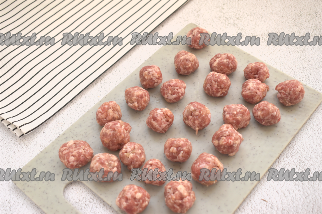 Из фарша лепим небольшие фрикадельки размером чуть меньше грецкого ореха.
