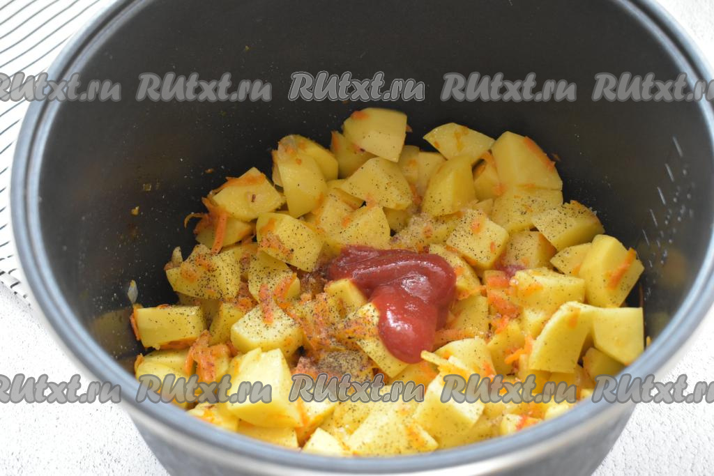 После окончания режима «Жарка» к картошке, обжаренной с морковкой и луком, добавляем томатный соус, по вкусу солим, всыпаем специи (у меня - чёрный молотый перец).