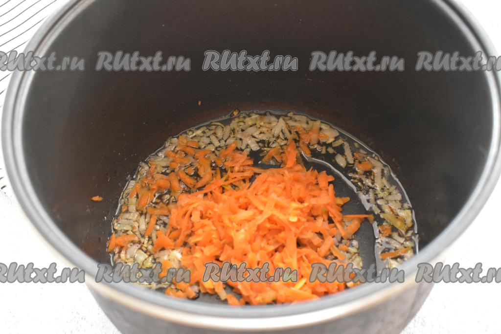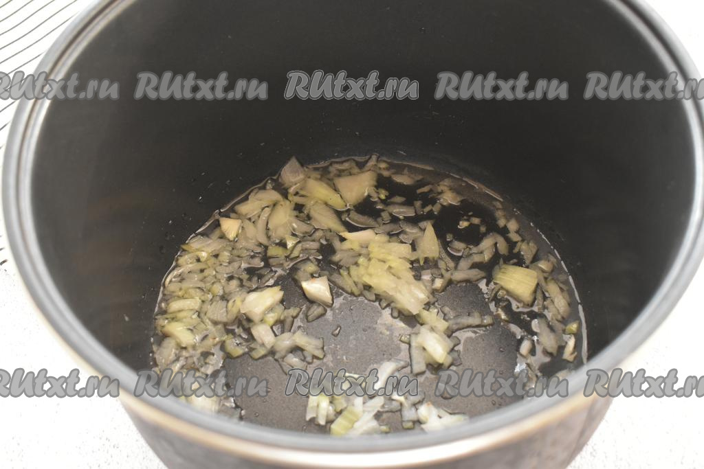 В съёмную чашу мультиварки вливаем растительное масло. Включаем режим «Жарка» на 15 минут. Вторую половину луковицы нарезаем мелко. Когда масло в мультиварке разогреется (прозвучит звуковой сигнал), выкладываем в чашу нарезанный лук, обжариваем его до прозрачности (примерно в течение 3 минут), иногда помешивая и не закрывая крышку мультиварки.