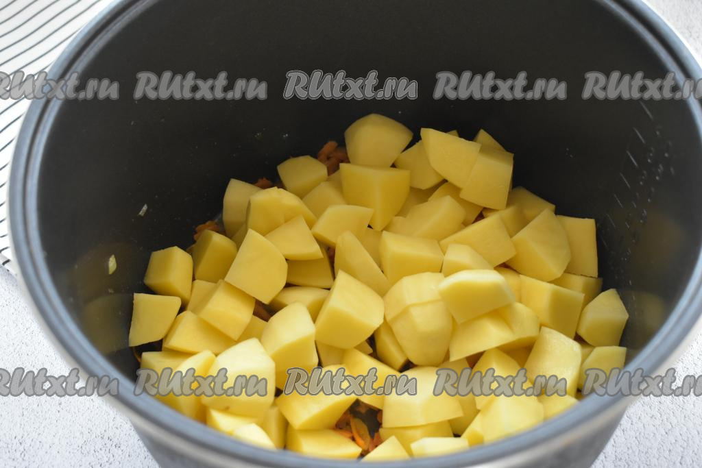 К обжаренным овощам добавляем картошку, нарезанную на средние кубики, перемешиваем. Обжариваем овощи минут 7 (до звукового сигнала, сообщающего об окончании режима "Жарка"), иногда перемешивая.