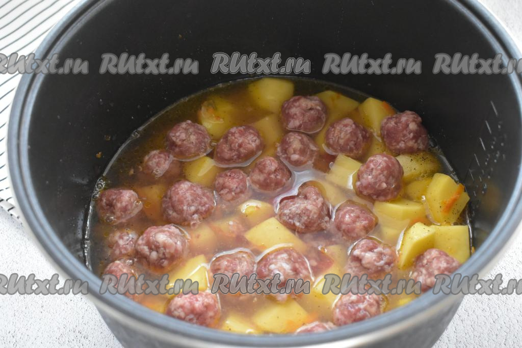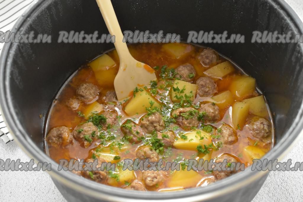 Закрываем крышку мультиварки и включаем режим «Тушение» на 45 минут. После звукового сигнала, означающего окончание режима "Тушение", проверяем готовность блюда по картофелю, он должен стать достаточно мягким, легко прокалываться вилкой. Если картошка осталась твердоватой (многое зависит от сорта картофеля и величины нарезки), тогда включите режим "Тушение" ещё на 5-10 минут. В конце приготовления к картошке с фрикадельками, по желанию, добавляем мелко нарезанную зелень (у меня - петрушка), перемешиваем.