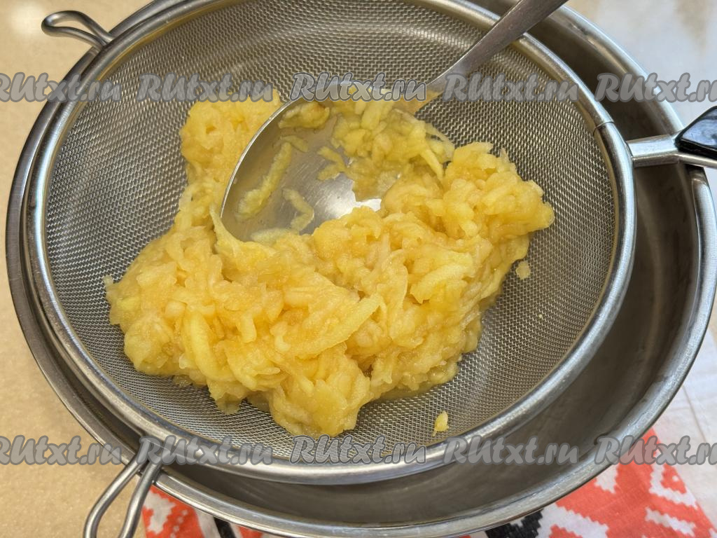 Взять миску, на неё поставить сито. Выложить в сито мягкую яблочную массу. Перетереть яблочную массу с помощью столовой ложки через сито в миску. В процессе перетирания в миске окажется однородное яблочное пюре. В сите останется практически сухие остатки яблочной массы, которые нам не понадобятся.