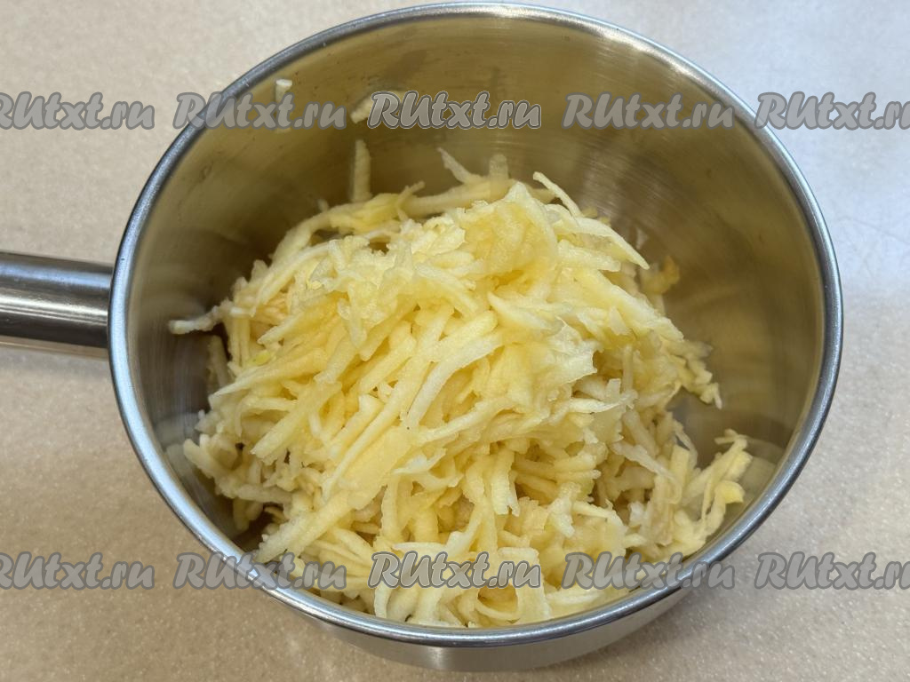 Яблоки, очищенные от кожуры, натереть на крупной тёрке, не затрагивая семенную коробку с семечками. Для приготовления мармелада потребуется 300 грамм натёртых яблок. Выложить натёртые яблоки в небольшую кастрюлю, влить 50 миллилитров воды, перемешать, поставить на огонь выше среднего.