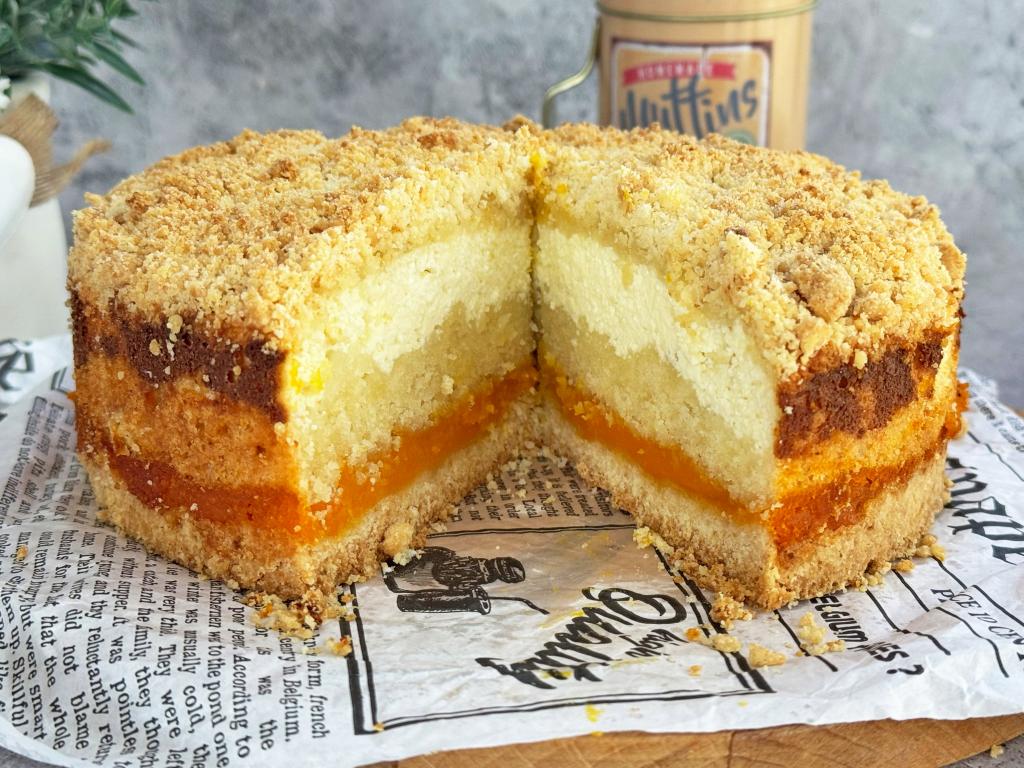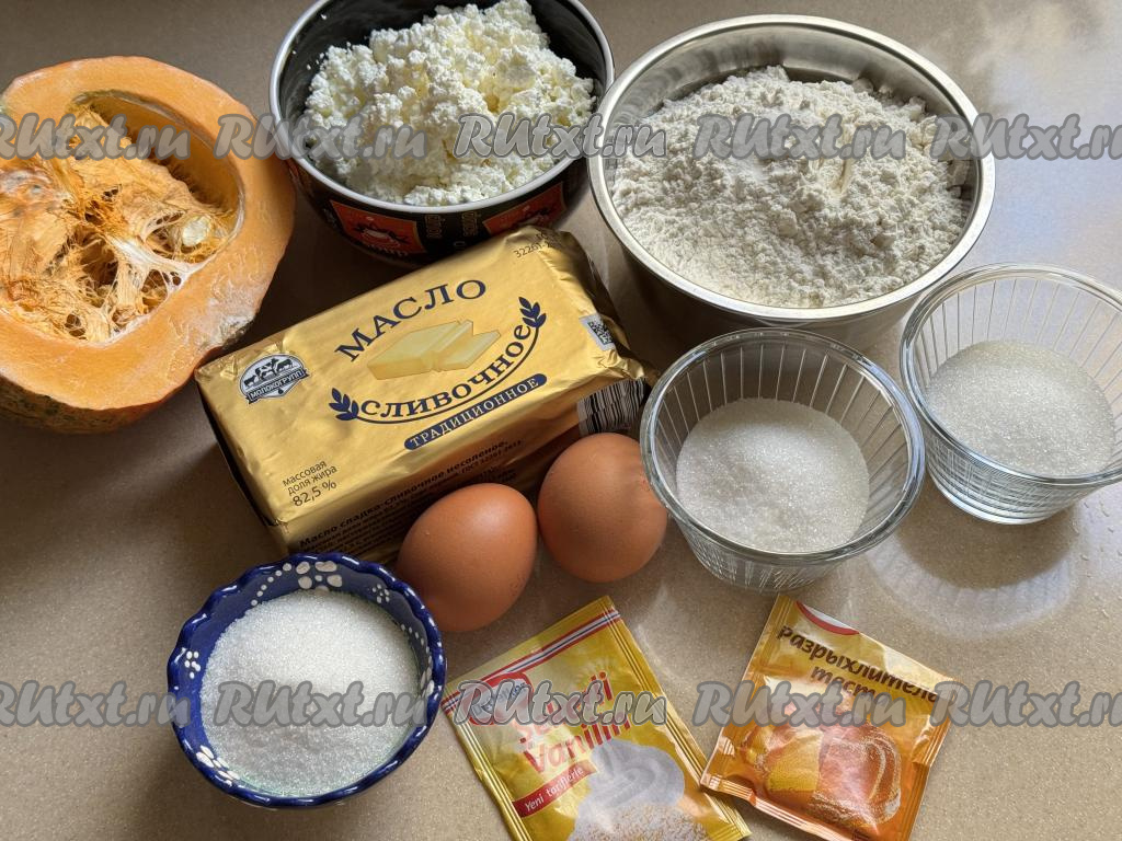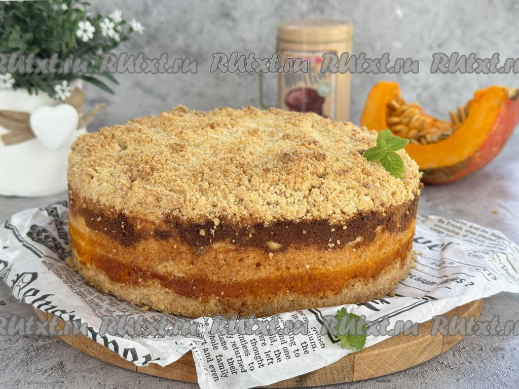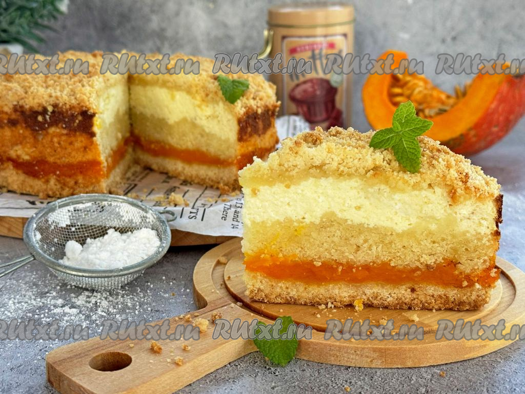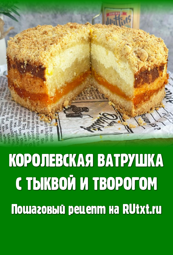 Равномерно выложить оставшуюся крошку, покрывая весь творожный слой. Поставить форму в духовку, разогретую до 170 градусов, выпекать королевскую ватрушка с тыквой и творогом 1 час (тесто должно приятно подрумяниться сверху).