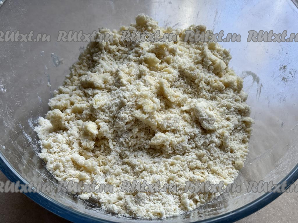 Перетереть руками сливочное масло с сухими ингредиентами до получения мелкой, однородной крошки.
