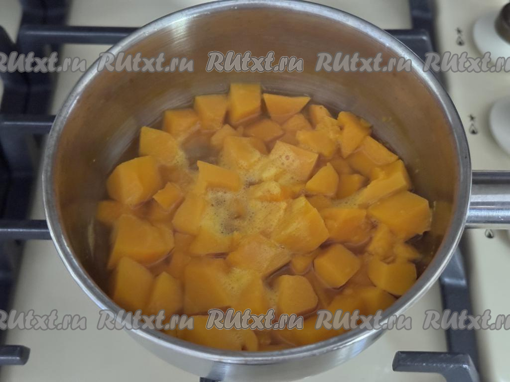 Вначале приготовим тыквенное пюре. Для этого 200 грамм тыквы, очищенной от кожуры и волокон с семечками, нужно нарезать на кубики, выложить в кастрюлю, влить 150 миллилитров воды, поставить на сильный огонь.