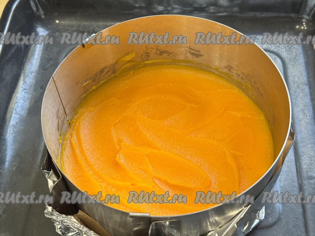 На получившийся слой из теста-крошки, выложить остывшее тыквенное пюре, разровнять лопаткой (или столовой ложкой).