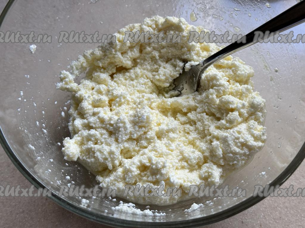 Перетереть содержимое миски вилкой до однородности и творожная начинка для королевской ватрушки готова.