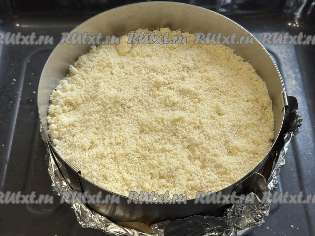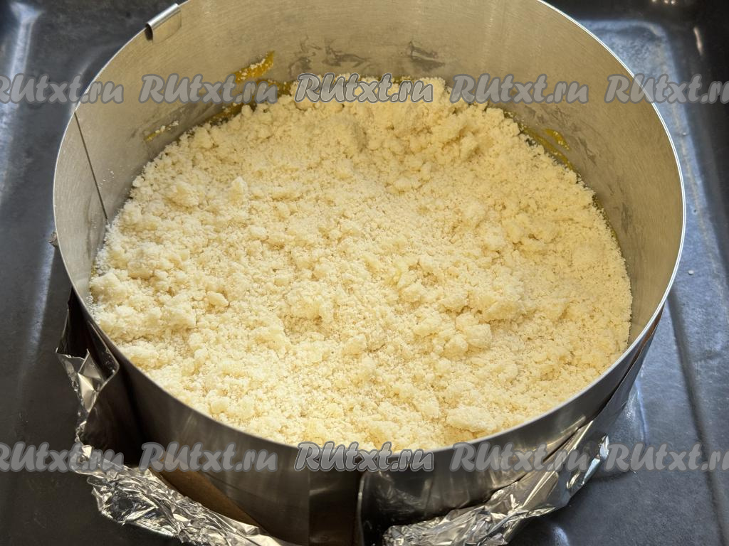 Разделить получившуюся песочную крошку на 3 равных части. Взять разъёмную форму для выпечки диаметром 20 сантиметров. Я в качестве формы использовала разъёмное кольцо диаметром 20 сантиметров, дно сформировала из пергамента и фольги, сложенной в несколько слоёв, затем поставила получившуюся форму на противень. В форму для выпечки выложить 1/3 часть крошки, слегка утрамбовать.