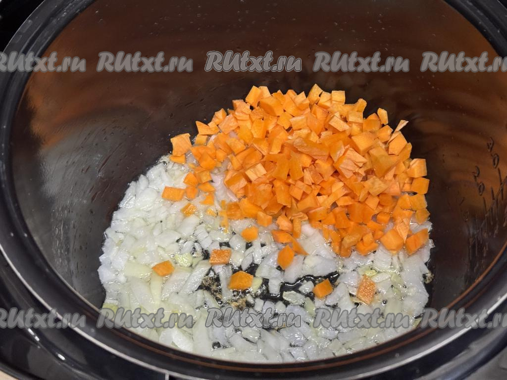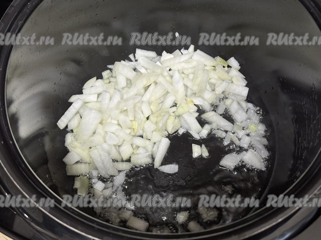 В чашу мультиварки влить растительное масло, выставить на 15 минут режим "Жарка". Выложить в чашу с маслом мелко нарезанный лук, обжарить его до прозрачности (в течение 6-7 минут), время от времени помешивая и не закрывая крышку мультиварки.