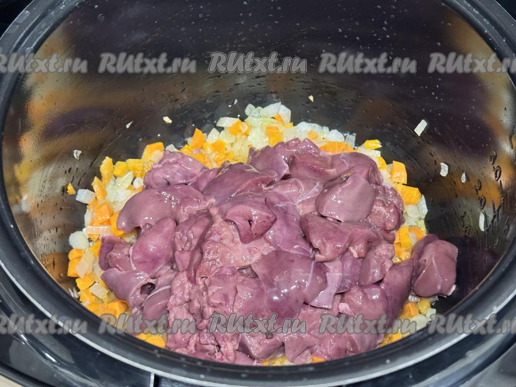 Обжарить овощи в течение 5-6 минут, не забывая иногда помешивать. Пока обжариваются овощи, куриную печень нужно промыть водой, крупные кусочки печёнки нарезать на части. К обжаренным овощам добавить подготовленную куриную печень, перемешать.