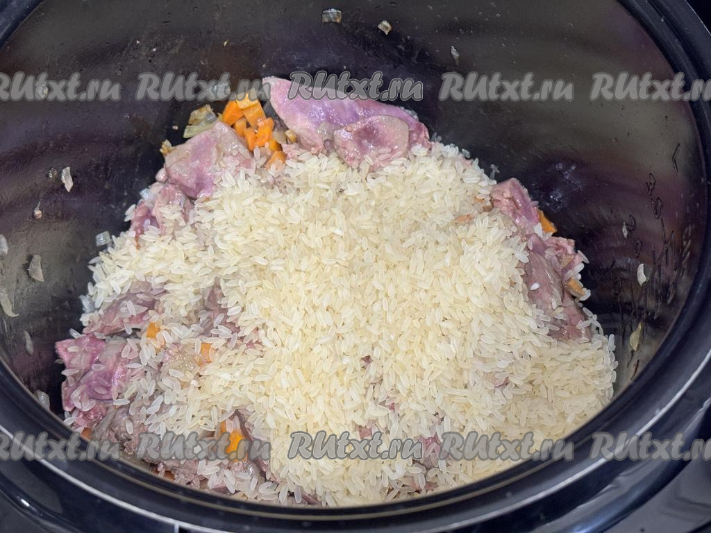 После окончания режима "Жарка" всыпать в чашу мультиварки подготовленный рис.