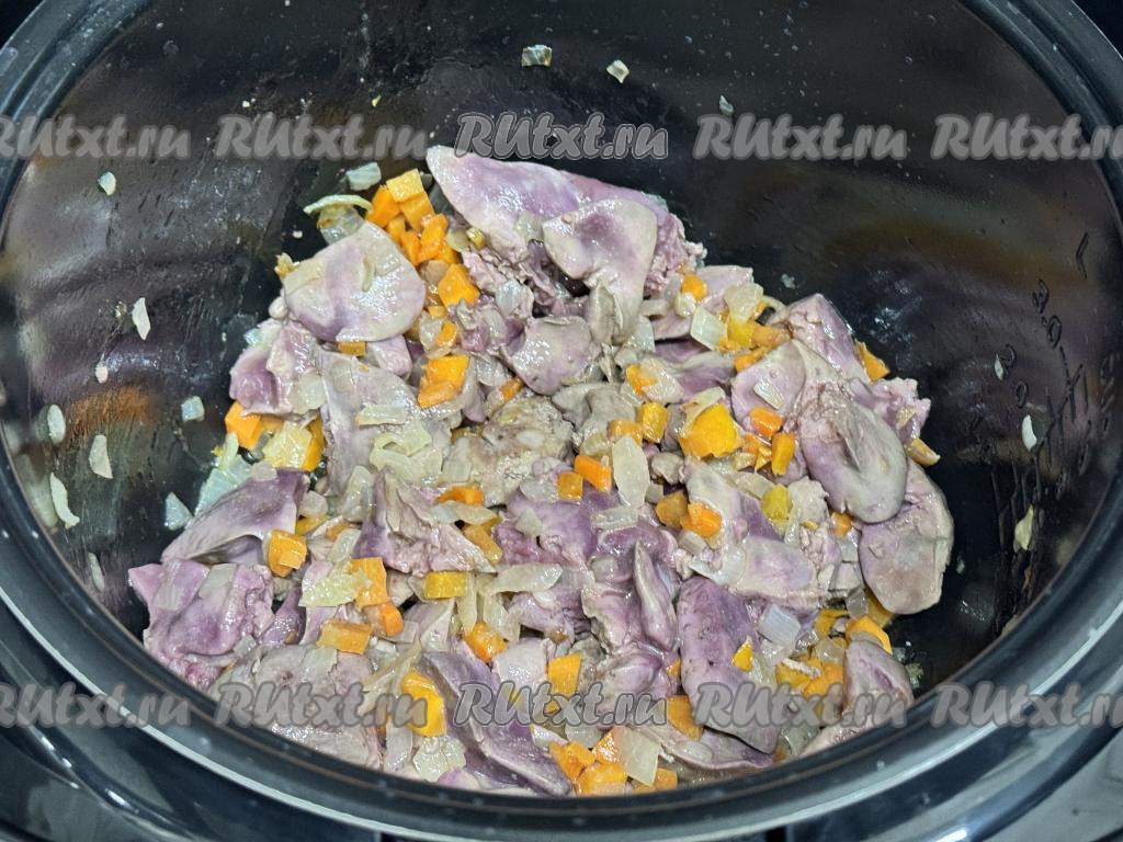 Обжарить печень с овощами в течение 3 минут (до окончания режима "Жарка"), иногда помешивая.